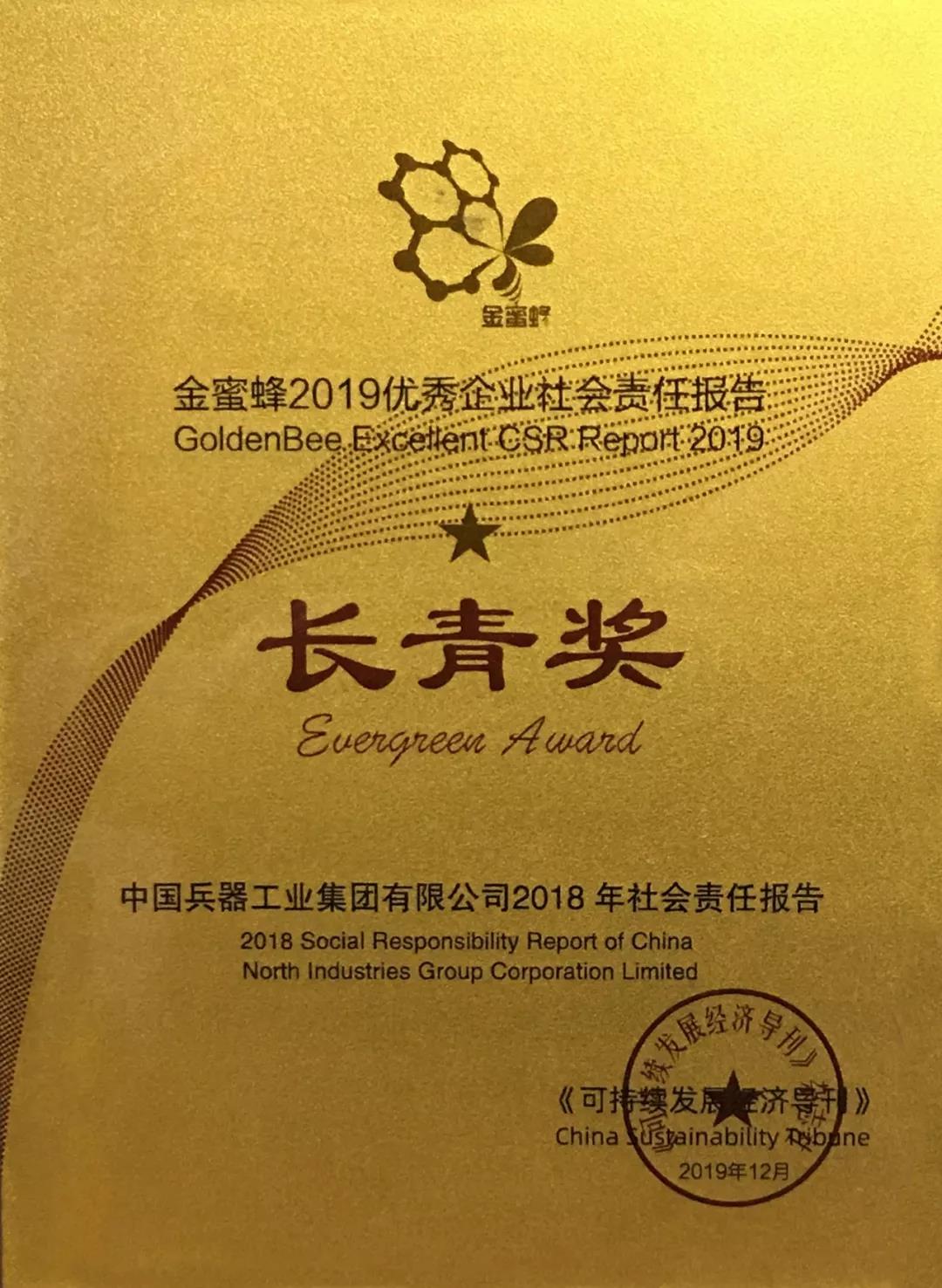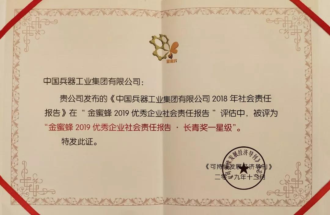 12月5日,在第十二屆中國企業社會責任報告國際研討會發布的“金蜜蜂2019優秀企業社會責任報告榜”上,《中國兵器工業集團有限公司2018年社會責任報告》從近1600份報告中脫穎而出,連續第二年榮獲“金蜜蜂優秀企業社會責任報告·長青獎”。同時,也是連續第6年獲得優秀企業社會責任報告獎項。