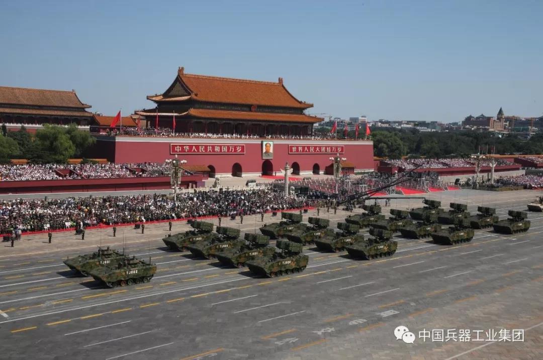 2015年9月3日,紀(jì)念抗戰(zhàn)勝利70周年閱兵在天安門(mén)廣場(chǎng)舉行,接受檢閱的27個(gè)裝備方隊(duì)中,兵器工業(yè)集團(tuán)研制生產(chǎn)的裝備占到13型,99A主戰(zhàn)坦克、紅箭10導(dǎo)彈發(fā)射車(chē)、11式輪式裝甲突擊車(chē)和35毫米自行高炮系統(tǒng)等裝備首次亮相。