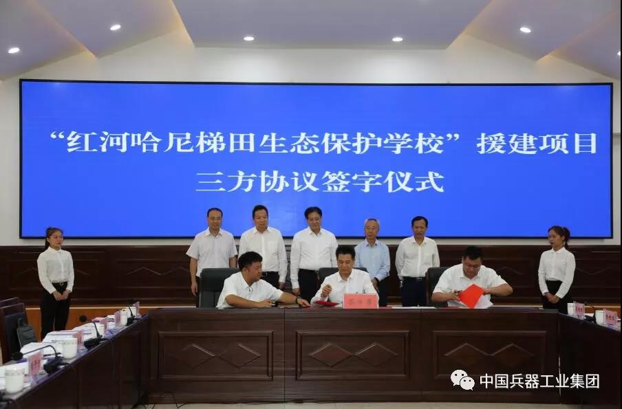 會上,兵器工業集團、中國扶貧基金會和紅河縣簽署了“紅河哈尼梯田生態保護學校”援建項目三方協議。