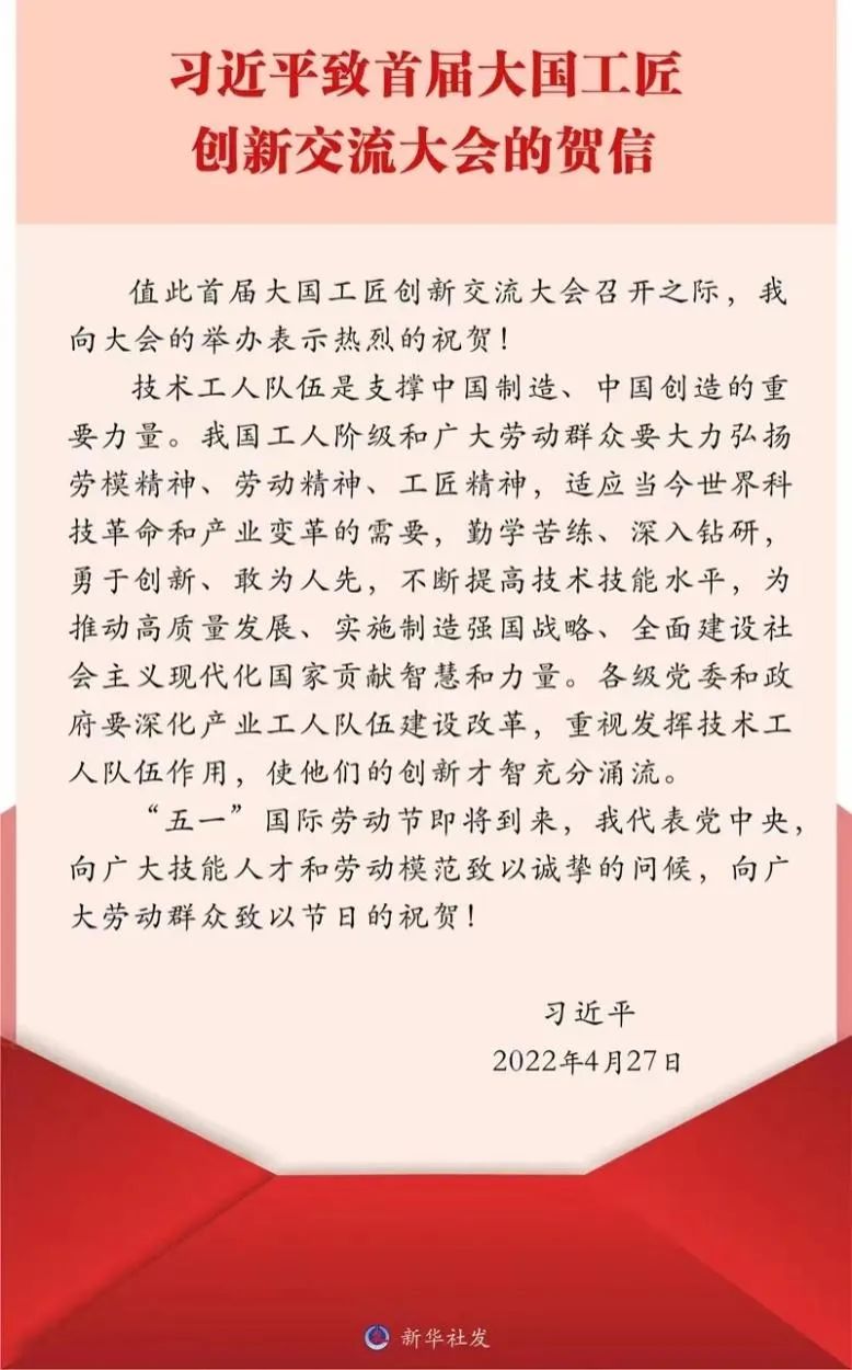 2022年4月27日,由中華全國總工會主辦,廣東省總工會、深圳市人民政府、中國職工技術協會承辦,各省、自治區、直轄市和各全國產業工會組織所屬單位參加的首屆大國工匠創新交流大會(以下簡稱“大會”)在北京開幕。中共中央總書記、國家主席、中央軍委主席習近平發來賀信,向大會的舉辦表示熱烈的祝賀,并在“五一”國際勞動節到來之際,代表黨中央向廣大技能人才和勞動模范致以誠摯的問候,向廣大勞動群眾致以節日的祝賀。