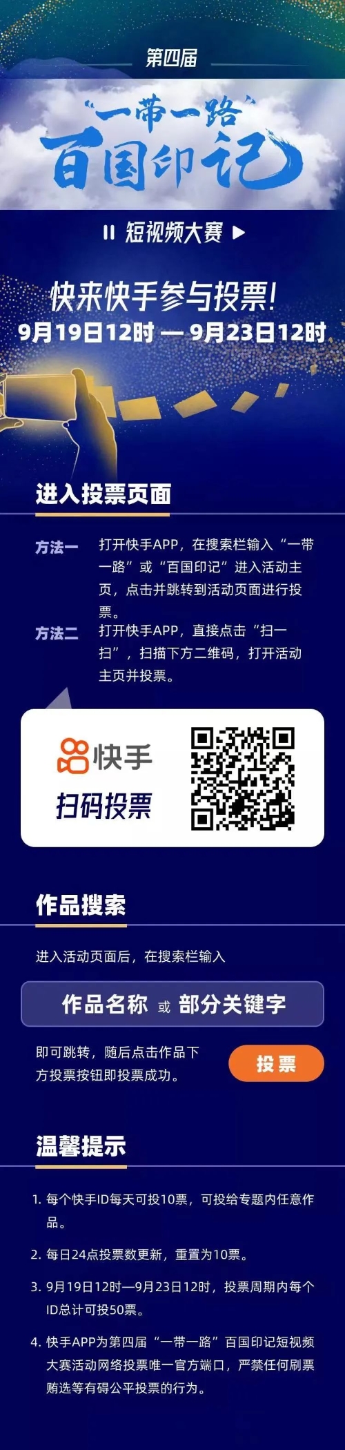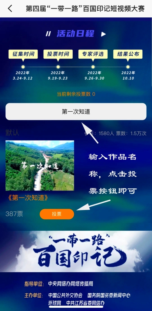 9月19日,由中央網信辦網絡傳播局指導,中國公共外交協會、國務院國資委新聞中心、環球網和中共江蘇省委網信辦聯合主辦的第四屆“一帶一路”百國印記短視頻大賽完成作品征集,正式開啟投票階段。