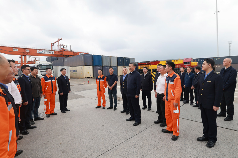 4月22日至24日,中共中央總書(shū)記、國(guó)家主席、中央軍委主席習(xí)近平在重慶考察。這是22日下午,習(xí)近平在重慶國(guó)際物流樞紐園區(qū)重慶鐵路集裝箱中心站,同貨車司機(jī)、列車司機(jī)、裝卸工人、場(chǎng)站管理人員等親切交流。