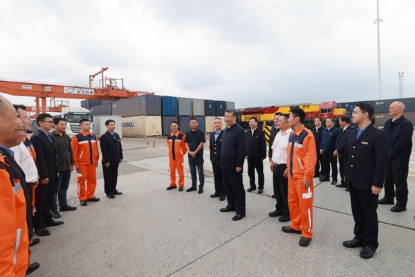 隨后,習(xí)近平來(lái)到重慶鐵路集裝箱中心站,聽(tīng)取貨物集散、運(yùn)輸路徑、運(yùn)營(yíng)成本和效益等介紹,同貨車司機(jī)、列車司機(jī)、裝卸工人、場(chǎng)站管理人員等親切交流,詢問(wèn)他們的工作強(qiáng)度、勞動(dòng)保護(hù)、節(jié)假日休息和收入情況。習(xí)近平說(shuō),大家在物流一線,也是在對(duì)外開(kāi)放一線,通過(guò)你們的辛勤勞動(dòng),很多商品跨越山海、走向世界,你們的工作很有意義。推動(dòng)西部大開(kāi)放、促進(jìn)西部大開(kāi)發(fā),物流很重要,大家要繼續(xù)努力,不斷創(chuàng)造新的業(yè)績(jī),作出新的貢獻(xiàn)。