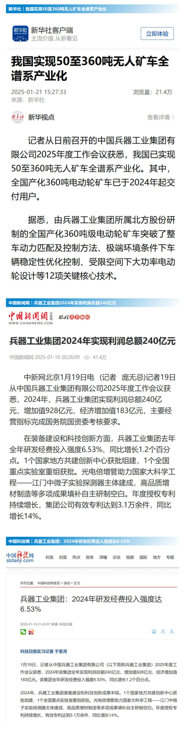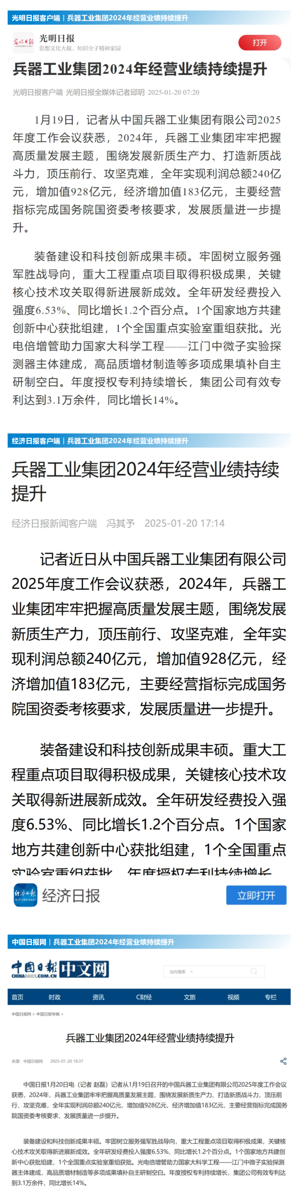 1月19日至20日,中國兵器工業(yè)集團有限公司2025年度工作會議在京召開,會議總結2024年工作,分析形勢任務,明確工作思路,部署2025年工作。 集團公司2024年取得的成績及下一步重點工作受到社會媒體廣泛關注。新華社、中國新聞網(wǎng)、中國科技網(wǎng)、光明日報客戶端、經(jīng)濟日報客戶端、中國日報網(wǎng)、國務院國資委網(wǎng)站、學習強國中央企業(yè)學習平臺、新浪網(wǎng)、網(wǎng)易網(wǎng)、搜狐網(wǎng)、騰訊網(wǎng)、鳳凰網(wǎng)等中央主流媒體、國家部委網(wǎng)站及知名網(wǎng)絡媒體對集團公司2025年度工作會議進行了報道,重點關注集團公司經(jīng)營業(yè)績、科技創(chuàng)新、產(chǎn)業(yè)結構布局優(yōu)化等情況。其中,新華社以《我國實現(xiàn)50至360噸無人礦車全譜系產(chǎn)業(yè)化》為題,重點報道了集團公司在推動智能制造水平提升方面取得的成效;中國新聞網(wǎng)、光明日報客戶端、經(jīng)濟日報客戶端、中國日報網(wǎng)等就集團公司2024年度經(jīng)營業(yè)績及各項工作取得的成果進行報道;中國科技網(wǎng)著重報道了集團公司在科技創(chuàng)新和優(yōu)化產(chǎn)業(yè)結構布局方面的最新進展。集團公司門戶網(wǎng)站、微信公眾號、微博等新媒體平臺以及《中國兵工報》也對集團公司工作會議進行了及時報道,各成員單位紛紛對相關內(nèi)容進行轉(zhuǎn)載,引發(fā)全系統(tǒng)關注。 集團公司職工及廣大網(wǎng)友熱議工作會 “2025年工作會為我們指明了發(fā)展方向、明確了奮斗目標,面對全新的機遇和挑戰(zhàn),作為兵工人深感責任重大。” “科技是第一生產(chǎn)力,一定要以科技創(chuàng)新引領新質(zhì)生產(chǎn)力發(fā)展,為高質(zhì)量發(fā)展提供支撐。” “把各項工作做深、做實、做細,努力為集團公司高質(zhì)量發(fā)展添磚加瓦。” “2024年中國兵器展示了大國重器,祝新的一年中再創(chuàng)輝煌!” |