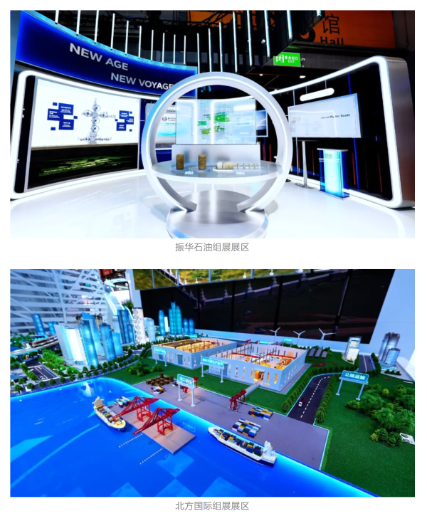振華石油以“一滴油的故事”串聯起從勘探開采到貿易服務的全產業鏈,揭示油氣勘探的地球密碼。北方礦業以《千里江山圖》為靈感,將綠色發展理念融入礦業開發,呈現“綠水青山就是金山銀山”的現代礦業新圖景。北方國際通過創新性的5D穹幕電影、UI互動屏幕、2.5D墻上沙盤等手段,帶領觀眾全景感知電力、礦產、交通等領域一體化建設的豐碩成果。奧信公司以一體化服務模型,凸顯全流程自主可控的核心優勢。